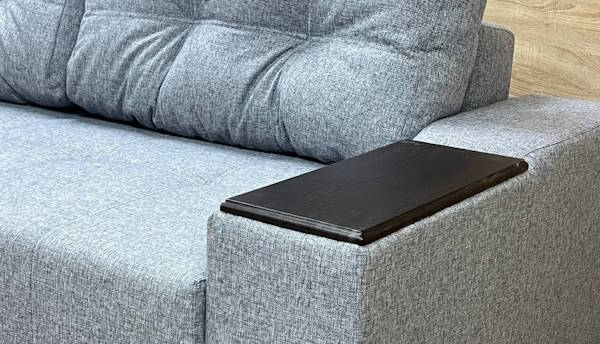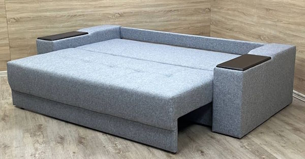 Особенный дизайн модели привлекает внимание с первого взгляда. Простые и четкие линии придают строгий и совершенный вид. Широкие подлокотники с деревянной вставкой превосходно дополняют изделие. Сиденье дивана декорировано простежкой из крупных квадратов. Низкая спинка уютно закрывает от стены. Встроенный механизм трансформации «еврокнижка» предназначен для ежедневного использования и отличается повышенной надежностью. В комплекте три объемные декоративные подушки.