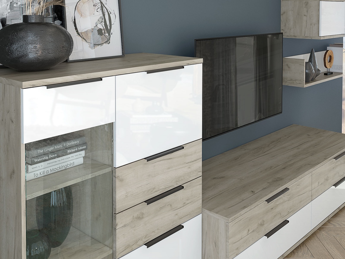 Комод-витрина Альянс 435.18 - входит в модульную гостиную Альянс. Корпус изготавливется из высококачественного ЛДСП в цвете Дуб крафт. Фасады дверей из ДСП, которые выкрашивается в четыре слоя высокоглянцевой краски в автоматизированной покрасочной камере. Фасады ящиков производятся из того же материала что и корпус. Петли на дверях четырехшарнирные с системой плавного закрывания. Направляющие ящиков шариковые полновыкатные. Ручки и опоры из черного прочного пластика. Комод универсален при сборке - собирается витринной частью как на левую, так и на правую стороны.
