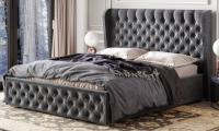высокое мягкое изголовье имеет декоративную стяжку с пуговицами, такой прием придает кровати элегантности.