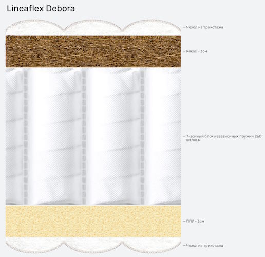 Благодаря мягкому соединению пружин, матрас Debora с легкостью подстраивается под контуры человеческой фигуры и этим обеспечивает наиболее комфортный отдых. Содержание латексированной кокосовой койры в наполнителе гарантирует эластичность и хорошую воздухопроходимость. В комплекте поставляется чехол из хлопкового жаккарда (20% хлопка). Стежка выполнена из экологичного файбера.