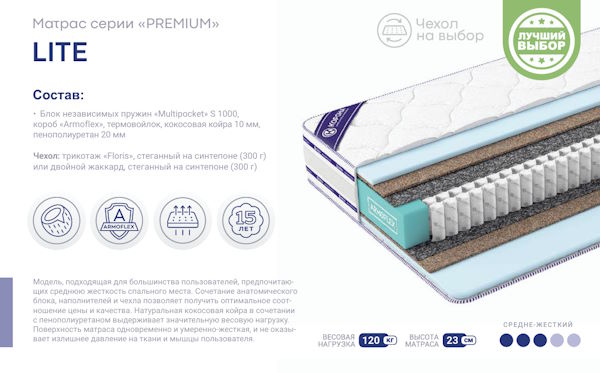 Модель, подходящая для большинства пользователей, предпочитающих среднюю жесткость спального места. Сочетание анатомического блока, наполнителей и чехла позволяет получить оптимальное соотношение цены и качества. Натуральная кокосовая койра в сочетании с пенополиуретаном выдерживает значительную весовую нагрузку. Поверхность матраса одновременно и умеренно-жесткая, и не оказывает излишнее давление на ткани и мышцы пользователя.