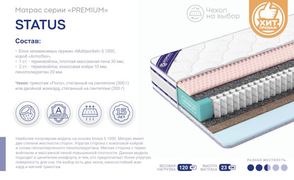 <virtues>Держит заявленную нагрузку</virtues> <limitations>Не заметили</limitations> <comment>Купили матрас Premium Status, так как искали удобный и качественный вариант для комфортного сна. Выбирали модель только средней жесткости, так как она идеально подходит для спины и не слишком мягкая. Размер матраса стандартный, идеально подошел к нашей кровати. Наполнитель оказался действительно качественным — поддержка отличная, спать удобно, и нет ощущения проваливания.</comment>